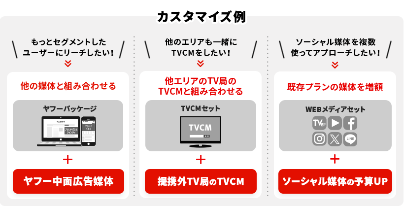 「各媒体の放映(掲載)回数増量」や「実施エリアの追加」などご予算に合わせてカスタマイズ可能です。